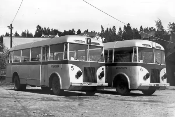 Ekebergbanens busser C-4055 og 4056, Mercedes/Høka 1942. Legg merke til lyktene. Disse hadde bare smale striper hvor lyset slapp ut pgs blendingspåbud. Østmarkruta, linje 71 til Abildsø.