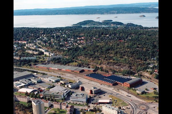 Europaveien (E 6), Ryensvingen. Ryenkrysset. Lambertseterbanen. Ryen industriområde. Vognhall / verksted for T-banen. Bekkelagshøgda i bakgrunnen. Ormøya, Malmøya og fjorden bakerst. (Flyfoto)
