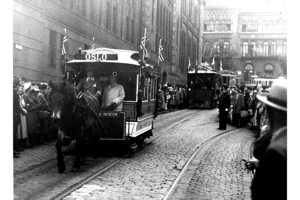 Stortinget, Wessels plass, Akersgata i bakgrunnen. 75-års jubileum for hestesporveien fra 1875. "Oslo" på vogna viser at linja går til bydelen Oslo (nåværende Gamlebyen) i Kristiania.