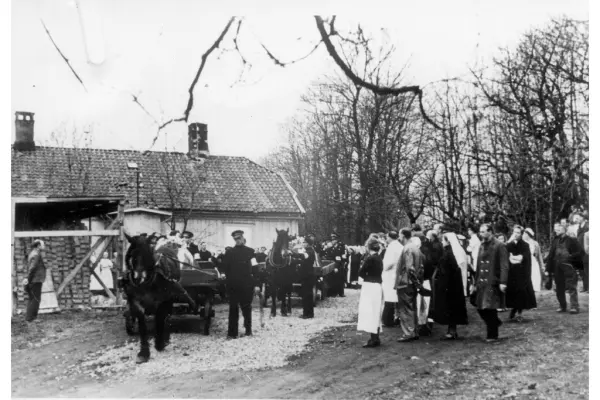 Fra gravfølget til de tre ukjente norske soldater idet prosesjonen setter i gang fra det eldste kjente våningshuset på Lille Ullevål. (Senere kalt Cederholm etter en svensk gartner som eide det.) Kistene er dekket med norske flagg.
