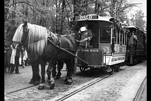 "Hestesporvei i opptog. 75-års jubileum for hestesporveien fra 1875. ""Oslo"" på vogna viser at linja går til bydelen Oslo (nåværende Gamlebyen) i Kristiania." Kristiania Sporveiselvskap.