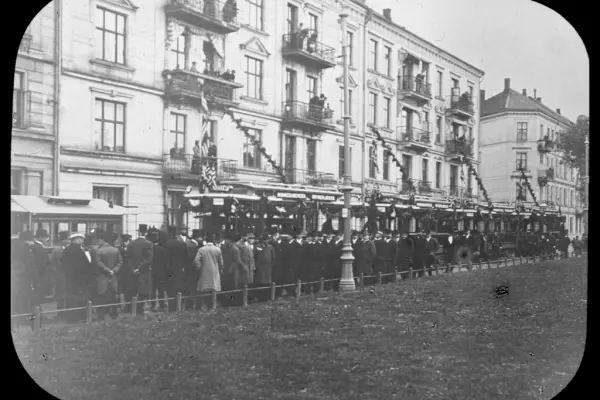 AS Kristiania Sporveisselskab (Grønntrikkens motorvogner 3 og 38) markerer med pomp og prakt at Munkedams-linjen ble elektrisfisert etter forlengelse til Torshov (fra Grünerløkka). Dermed var hestesporvogntiden over. Sporveisansatte og dignitærer utenfor Torshov vognhall.