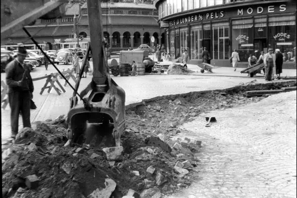 Gravearbeid fra Biskop Gunnerus' gate nedenfor Kirkeristen og Doblouggården (med J. Lunder A/S pelsforretning), sannsynligvis da Sporveien skulle bygge trikkespor i Skippergata i 1953.