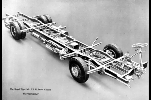 Chassis, 1956. Strømmen Verksted var tidlig ute med å produsere busser med selvberende karosseri i almunium. Dette er antagelig understellet til en buss produsert på Strømmen