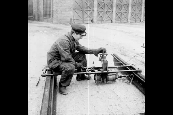 Arbeid med skinner utenfor vognhall/verksted på Sagene, som ble bygget av Kristiania Kommunale Sporveie, men kjøpt opp av AS Kristiania Sporveisselskap i 1905