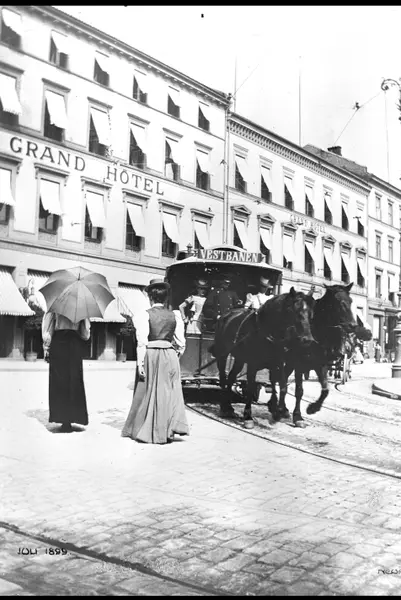 Hestesporvogn utenfor Grand Hotel. Hestesporvognen i Oslo kom i 1875. Hestesporvogn med to hester og dobbelspor. Grand hotel med gammel fasade før 1913. Anlagt ledninger for elektrisk sporveier. Bildet datert 1899.