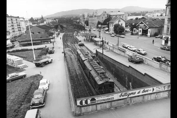 Majorstuen stasjon sett fra Majorstuhuset, tog på vei inn i tunnelen. Sannsynligvis fra 1979 eller seinere, pga. Ford Granada og Volvo 240, med modelltyper som først kom i 1977 og 1979.