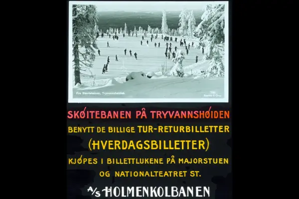 Skøitebanen på Tryvannshøiden. Benytt de billige tur-returbilletter (hverdagsbilletter). Kjøpes i billettlukene på Majorstuen og Nationalteatet st. A/S Holmenkolbanen