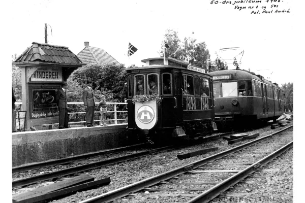 Holmenkollbanens 50 års-jubileum markeres på Vindern stasjon ved den eldste og den nyeste vogntypen. Nr 1 er produsert av MAN og fra 1898, mens nummer 501 er produsert av Skabo i 1947