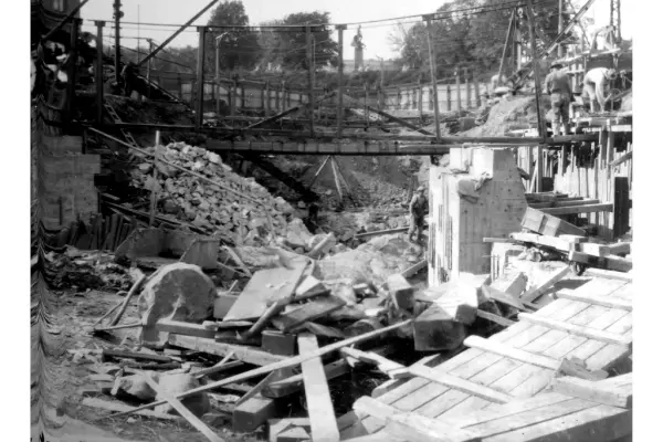 Bygging av Nationaltheateret stasjon under anleggsarbeidet med undergrunnsbanen mellom Majorstuen og Nationaltheatret. Slottsparken med Abelstatuen i bakgrunnen. Holmenkollbanen