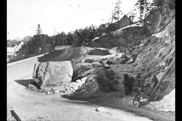 Arbeidere med hest og kjerre til høyre, Ryenbergveien. Dagens adresse er Ryenbergveien 73-75, Oslo Panorama Ekeberg. På venstre side av veien bygges det i 2010 og 2011 boligblokkene Konows Tårn.