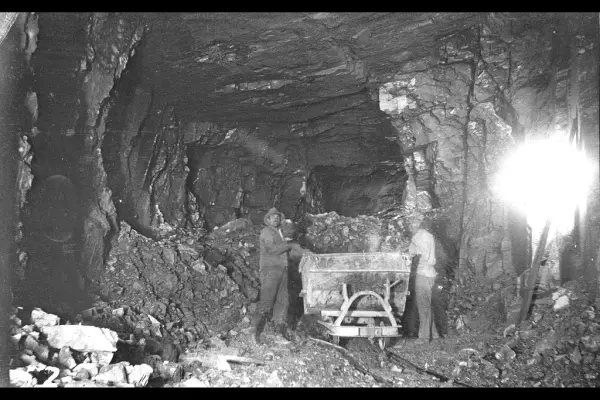 Arbeid i fjelltunnel, lasting av stein på tralle for utkjøring. Fra tunnelen som ble anlagt for å lede Lysakerelva gjennom fjellet på Bærumssiden for å tillate anlegg av fylling på tvers av elveleiet. Fra arbeidet med forlengelsen av Lilleakerbanen til Bekkestua og Haslum, ferdig 1924.