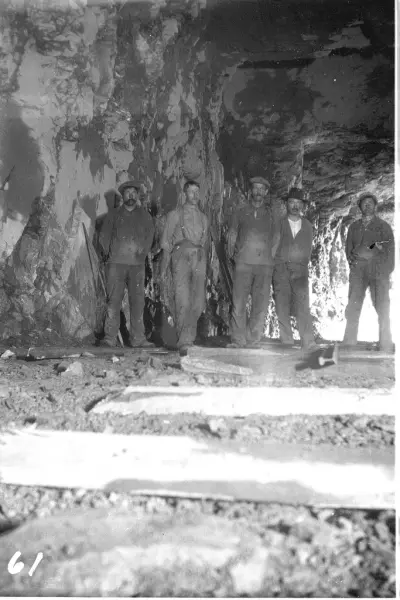 Arbeidslag i tunnel(åpning). Fra tunnelen som ble anlagt for å lede Lysakerelva gjennom fjellet på Bærumssiden for å tillate anlegg av fylling på tvers av elveleiet. Fra arbeidet med forlengelsen av Lilleakerbanen til Bekkestua og Haslum, ferdig 1924.