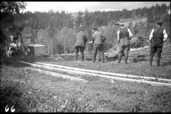 Arbeidere drar smalsporet anleggslokomotiv med forbrenningsmotor - se A-40208/Uab/0003/065 og A-40208/Uab/0003/070. Sannsynligvis fra Tjernsrud. Fra arbeidet med forlengelsen av Lilleakerbanen til Bekkestua og Haslum, ferdig 1924.