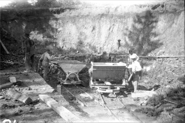 Bildet er tatt under arbeidet med forlengelsen av Lilleakerbanen til Bekkestua og Haslum. Arbeidere med vogner. Forlengelsen stod ferdig 1924. Bildet er tatt 21.08.1922