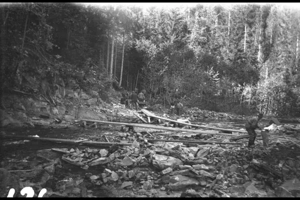 Bildet er tatt under arbeidet med forlengelsen av Lilleakerbanen til Bekkestua og Haslum. Forlengelsen stod ferdig 1924. Provisoriske broer over Lysakerelva.