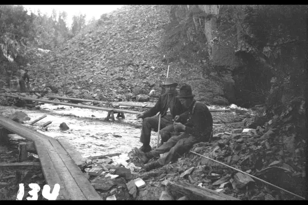 Bildet er tatt under arbeidet med forlengelsen av Lilleakerbanen til Bekkestua og Haslum. Forlengelsen stod ferdig 1924. Provisoriske broer over Lysakerelva.