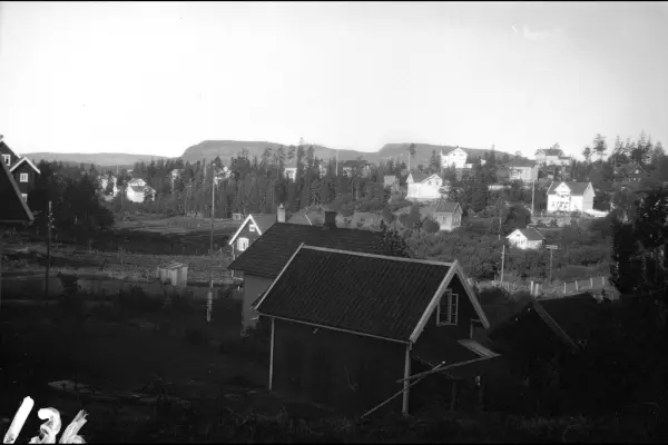 Bybildet er tatt under arbeidet med forlengelsen av Lilleakerbanen til Bekkestua og Haslum. Forlengelsen stod ferdig 1924. Ved den tidligere Egne Hjem stasjon. Egne Hjems vei går fra venstre til høyre, bebeyggelse i Bjerkelundsvn. i bakgrunnen.