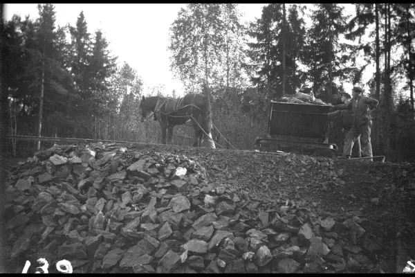 Bildet er tatt under arbeidet med forlengelsen av Lilleakerbanen til Bekkestua og Haslum. Forlengelsen stod ferdig 1924. Hest, vogn og anleggsarbeider på traséen.