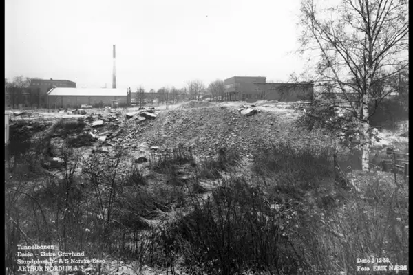Utsikt over anleggsområdet fra A/S Norske Esso. Nitedal hjelpestikker - fyrstikkfabrikk i bakgrunnen. Fotografi tatt i forbindelse med forarbeid av tunnelbane til Lambertseter