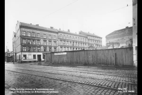 Rødfyllgata 36 til venstre, leiegårder på gamle Vaterland. Nr. 27 til høyre var eid av Oslo kommune. Vognmannsgata. Området ble sanert på 1960-tallet under utbyggingen av Tunnelbanen.