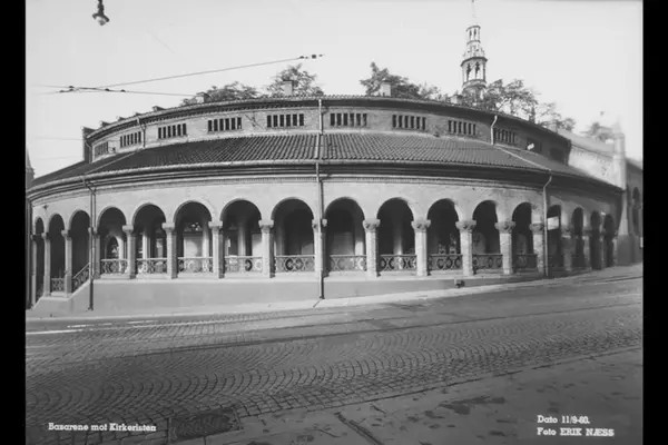 Opprinnelig slakterboder med overbygde arkader foran, bygd 1840-59 i upusset rød tegl i nyromantisk stil av arkitekt Christian H. Grosh. Antall boder mer enn fordoblet i 1859. Dronningens gate 27 ned mot venstre.
