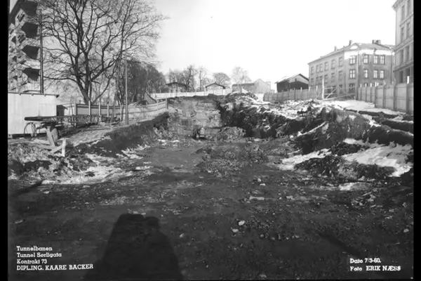 Tunnelbanekontoret anlegger tunnel i Sørligata, Heibergløkka med daghjem i bakgrunn, opprinnelig sommerbolig oppført 1847 for kirurg Heiberg. Tøyen transformator stasjon helt bakerst