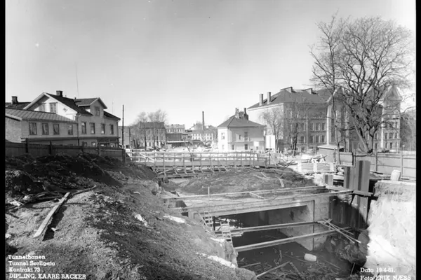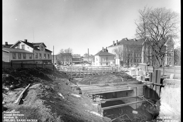 Tunnelbanekontoret anlegger tunnel i Sørligata, Tøyen skoles fasade i pusset tegl til høyre, tatt i bruk 1881, Hagegata midt på bildet, til venstre ligger nå Tøyen senter.