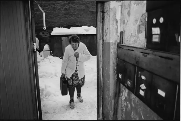 Eldre dame på vei inn i oppgangen med parafinkanne. Bildet er publisert på s. 132 - 133 i boka Oslo-bilder. Fotografiet er fra prosjektet og boka ''Oslo-bilder. En fotografisk dokumentasjon av bo og leveforhold i 1981 - 82''. Kontakt Samfoto/Scanpix ved ev. bestilling av kopier.