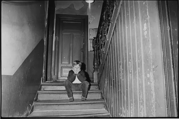 Gutt som sitter i trappen. Fotografiet er fra prosjektet og boka ''Oslo-bilder. En fotografisk dokumentasjon av bo og leveforhold i 1981 - 82''. Kontakt Samfoto ved ev. bestilling av kopier.