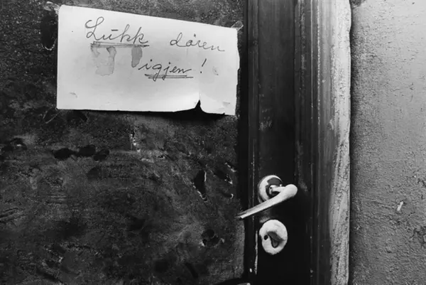 Oppslag til beboerne på døra i Håkons gate 14. Fotografiet er fra prosjektet og boka ''Oslo-bilder. En fotografisk dokumentasjon av bo og leveforhold i 1981 - 82''. Kontakt Samfoto ved ev. bestilling av kopier.