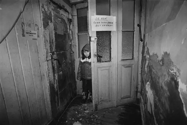 Jente på vei inn gjennom døra i en nedslitt oppgang. Innvandrernes boforhold. Fotografiet er fra prosjektet og boka ''Oslo-bilder. En fotografisk dokumentasjon av bo og leveforhold i 1981 - 82''. Kontakt Samfoto ved ev. bestilling av kopier.