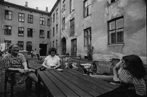 Bakgård med kvinner i samtale rundt et hagebord. Barnevogner. Fotografiet er fra prosjektet og boka ''Oslo-bilder. En fotografisk dokumentasjon av bo og leveforhold i 1981 - 82''. Kontakt Samfoto ved ev. bestilling av kopier.
