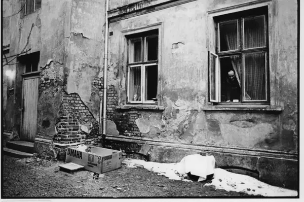 Mann som tittet ut av vinduet i forfallen bakgård. Tromsøgata 2. Fotografiet er fra prosjektet og boka ''Oslo-bilder. En fotografisk dokumentasjon av bo og leveforhold i 1981 - 82''. Kontakt Samfoto ved ev. bestilling av kopier.