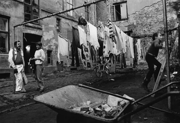 Samtale i bakgården. Klesvask til tørk. Barns oppvekstvilkår. Bildet er publisert på s. 74 - 75 i boken Oslo bilder. Fotografiet er fra prosjektet og boka ''Oslo-bilder. En fotografisk dokumentasjon av bo og leveforhold i 1981 - 82''. Kontakt Samfoto ved ev. bestilling av kopier.