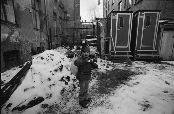 Liten gutt i bakgården vinterstid. Heimdalsgata 38. Bildet er publisert på s 90 - 91 i boken Oslo-bilder. Fotografiet er fra prosjektet og boka ''Oslo-bilder. En fotografisk dokumentasjon av bo og leveforhold i 1981 - 82''. Kontakt Samfoto ved ev. bestilling av kopier.