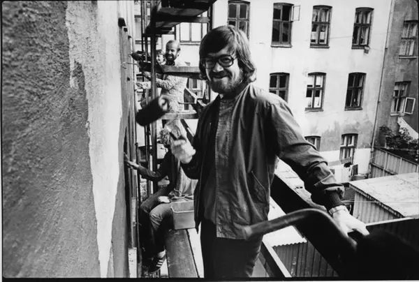 Stillas. Rehabilitering av bygård. Byfornyelse. Malere i sving. Fotografiet er fra prosjektet og boka ''Oslo-bilder. En fotografisk dokumentasjon av bo og leveforhold i 1981 - 82''. Kontakt Samfoto ved ev. bestilling av kopier.