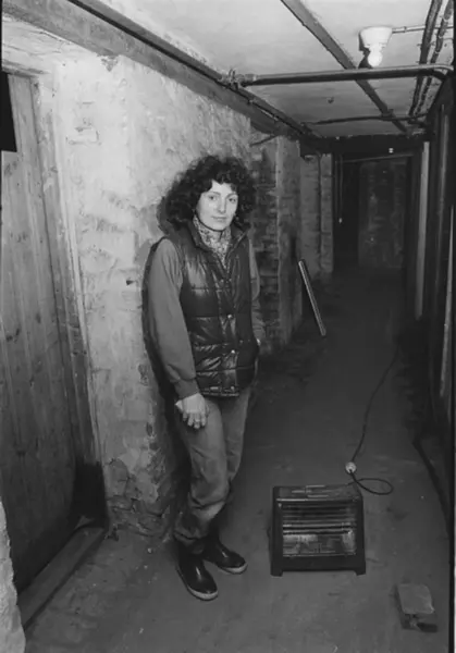 Kvinne i kjelleren i Hegdehaugsveien 18. Stråleovn på gulvet for å hindre frost. Fotografiet er fra prosjektet og boka ''Oslo-bilder. En fotografisk dokumentasjon av bo og leveforhold i 1981 - 82''. Kontakt Samfoto ved ev. bestilling av kopier.