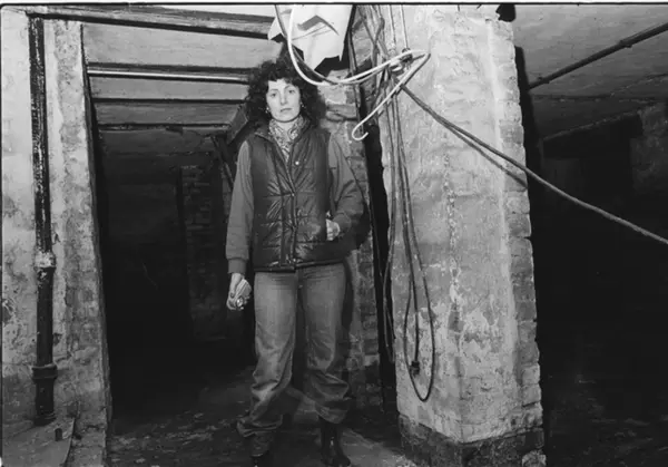 Kvinne i kjelleren i Hegdehaugsveien 18. Forfallen bygård. Løse ledninger, lommelykt i hånda. Fotografiet er fra prosjektet og boka ''Oslo-bilder. En fotografisk dokumentasjon av bo og leveforhold i 1981 - 82''. Kontakt Samfoto ved ev. bestilling av kopier.
