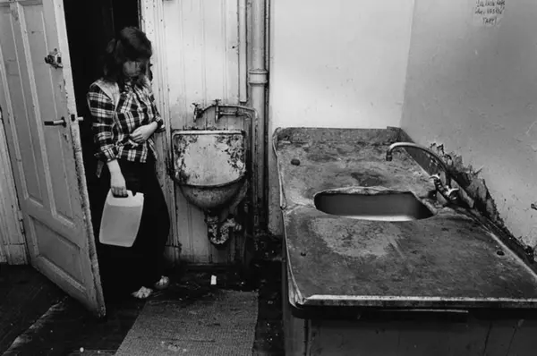 Kvinne på forfallent kjøkken. Fotografiet er fra prosjektet og boka ''Oslo-bilder. En fotografisk dokumentasjon av bo og leveforhold i 1981 - 82''. Kontakt Samfoto ved ev. bestilling av kopier.