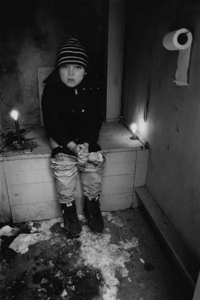 Gutt på utedo med tente stearinlys i bygård. Håkons gate 14. Fotografiet er fra prosjektet og boka ''Oslo-bilder. En fotografisk dokumentasjon av bo og leveforhold i 1981 - 82''. Kontakt Samfoto ved ev. bestilling av kopier.