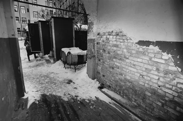 Utedo i bygård. Parafinfat i forkant. Jfr. bilde A-70013/Ud/0001/020 Fotografiet er fra prosjektet og boka ''Oslo-bilder. En fotografisk dokumentasjon av bo og leveforhold i 1981 - 82''. Kontakt Samfoto ved ev. bestilling av kopier.