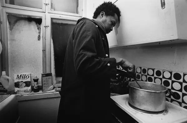 Kummerlige boforhold. På kjøkkenet er det så kaldt at vinduet er islagt. Innvandrer lager mat på kjøkkenet. Mange søknader til Boligsjefen forteller om fortvilte boforhold og for dårlig økonomi til å kjøpe egne leiligheter. Bildet er publisert på s. 46 - 47 i boken Oslo-bilder. Innvandrernes boforhold. Fotografiet er fra prosjektet og boka ''Oslo-bilder. En fotografisk dokumentasjon av bo og leveforhold i 1981 - 82''. Kontakt Samfoto ved ev. bestilling av kopier.