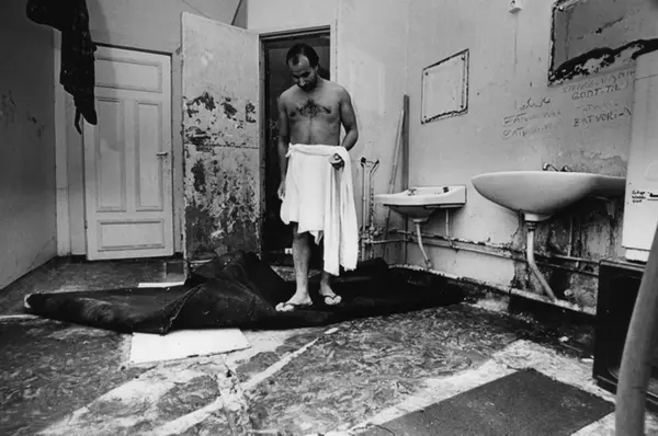 Forfallent bad i bygård. Tesksten på veggen: "Stenge vannet godt til!" på flere språk, også urdu? Innvandrernes boforhold. Jfr. bilde A-70013/Ud/0001/022 Fotografiet er fra prosjektet og boka ''Oslo-bilder. En fotografisk dokumentasjon av bo og leveforhold i 1981 - 82''. Kontakt Samfoto ved ev. bestilling av kopier.