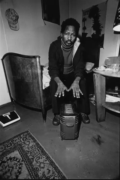 Innvandrer varmer seg ved en stråleovn. Innvandrernes boforhold. Fotografiet er fra prosjektet og boka ''Oslo-bilder. En fotografisk dokumentasjon av bo og leveforhold i 1981 - 82''. Kontakt Samfoto ved ev. bestilling av kopier.