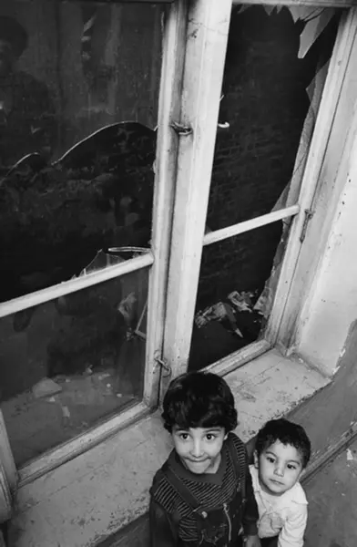 Barn i trappeoppgang. Knust rute. Innvandrernes boforhold. I en søknad til Boligsjefen i Oslo går det fram at en familie på to voksne og fem barn bodde i en to-roms leilighet. En annen like stor familie bodde på andre sida av gangen, men hadde adkomst gjennom deres kjøkken! Fotografiet er fra prosjektet og boka ''Oslo-bilder. En fotografisk dokumentasjon av bo og leveforhold i 1981 - 82''. Kontakt Samfoto ved ev. bestilling av kopier.