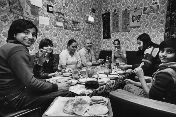 Pakistansk familie samlet til måltid i stua. Innvandrernes boforhold. Fotografiet er fra prosjektet og boka ''Oslo-bilder. En fotografisk dokumentasjon av bo og leveforhold i 1981 - 82''. Kontakt Samfoto ved ev. bestilling av kopier.