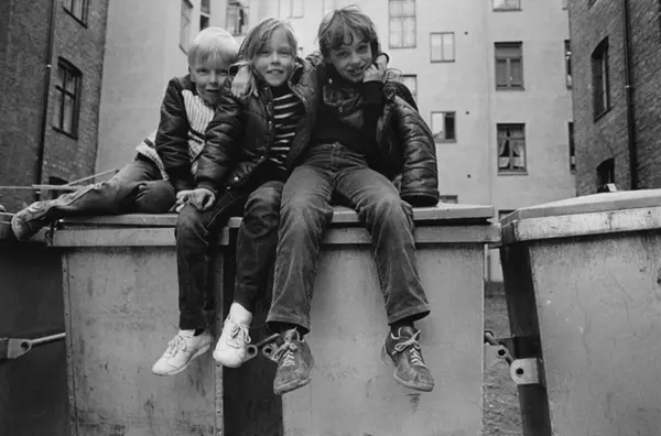Tre barn på søppelkassene i forfallen bakgård. Med bakgården som lekeplass. På søppelkasselokket. Fotografiet er fra prosjektet og boka ''Oslo-bilder. En fotografisk dokumentasjon av bo og leveforhold i 1981 - 82''. Kontakt Samfoto ved ev. bestilling av kopier.