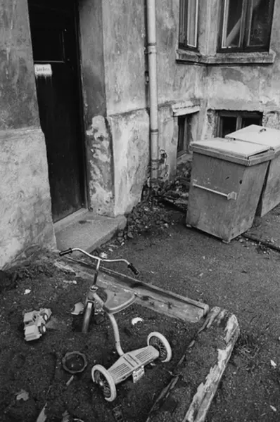 Sandkasse med en trehjulssykkel på den ene og søppelkasser på den andre siden av inngangsdøra. Med bakgården som lekeplass. Fotografiet er fra prosjektet og boka ''Oslo-bilder. En fotografisk dokumentasjon av bo og leveforhold i 1981 - 82''. Kontakt Samfoto ved ev. bestilling av kopier.