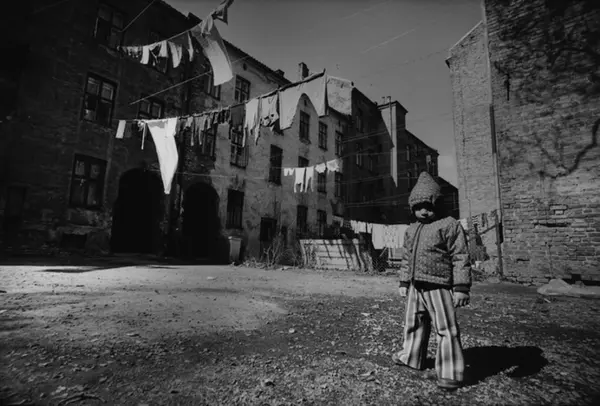 Liten gutt i lek i bakgården. Klær til tørk på klessnorer tvers over gårdsrommet. Innvandrernes boforhold. Bildet er publisert på s. 37 i boken Oslo-bilder. Fotografiet er fra prosjektet og boka ''Oslo-bilder. En fotografisk dokumentasjon av bo og leveforhold i 1981 - 82''. Kontakt Samfoto ved ev. bestilling av kopier.